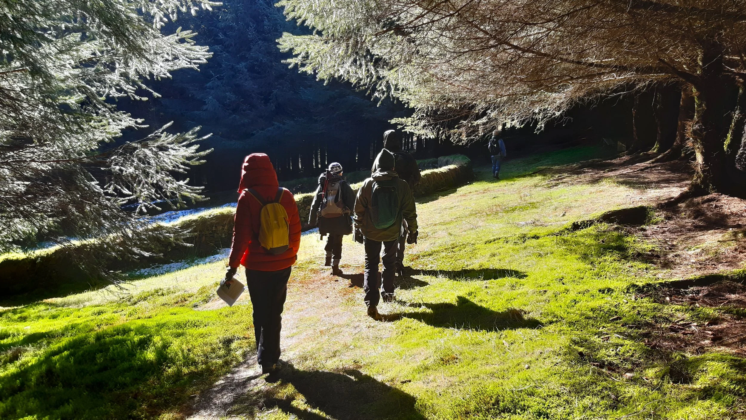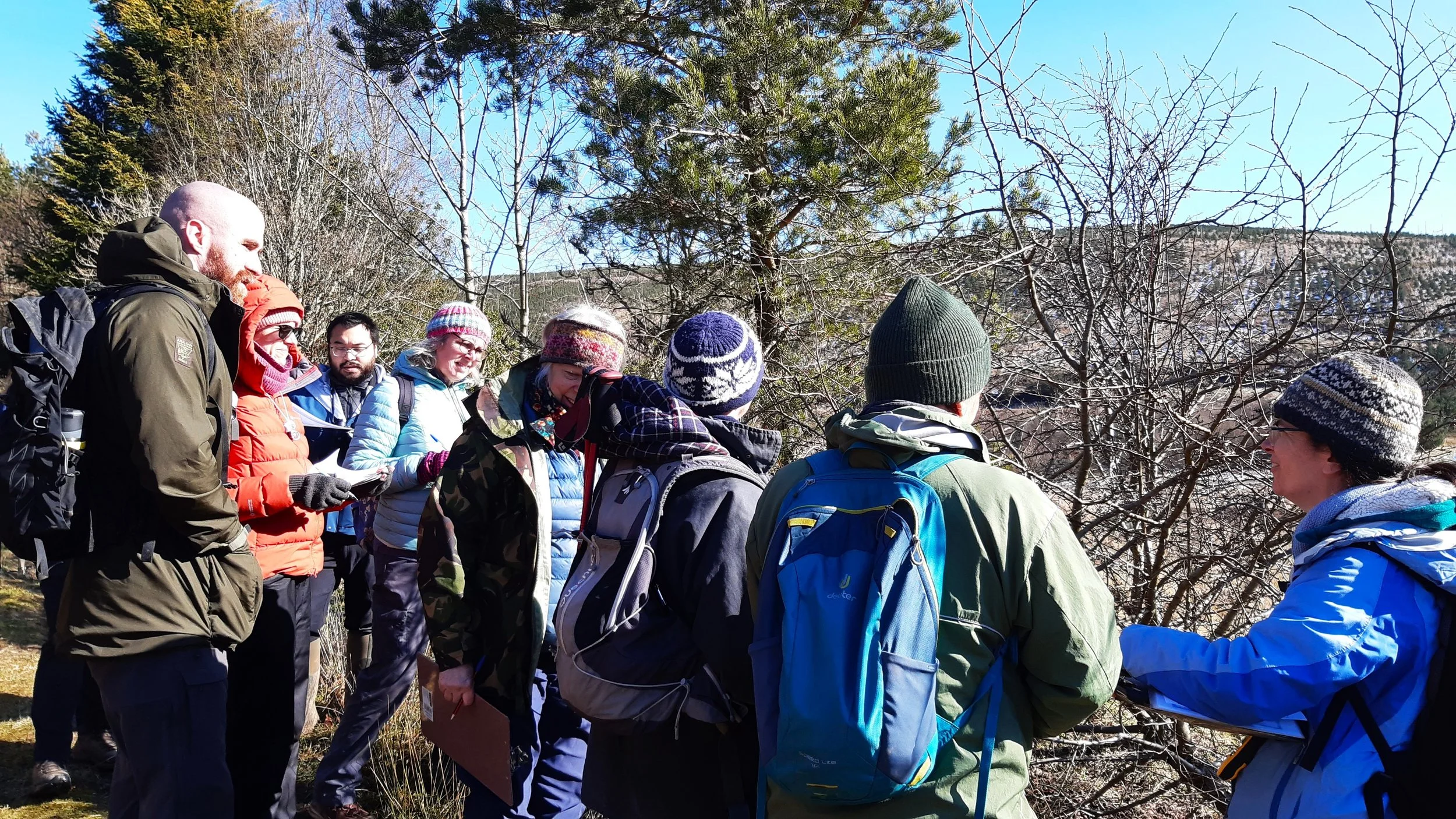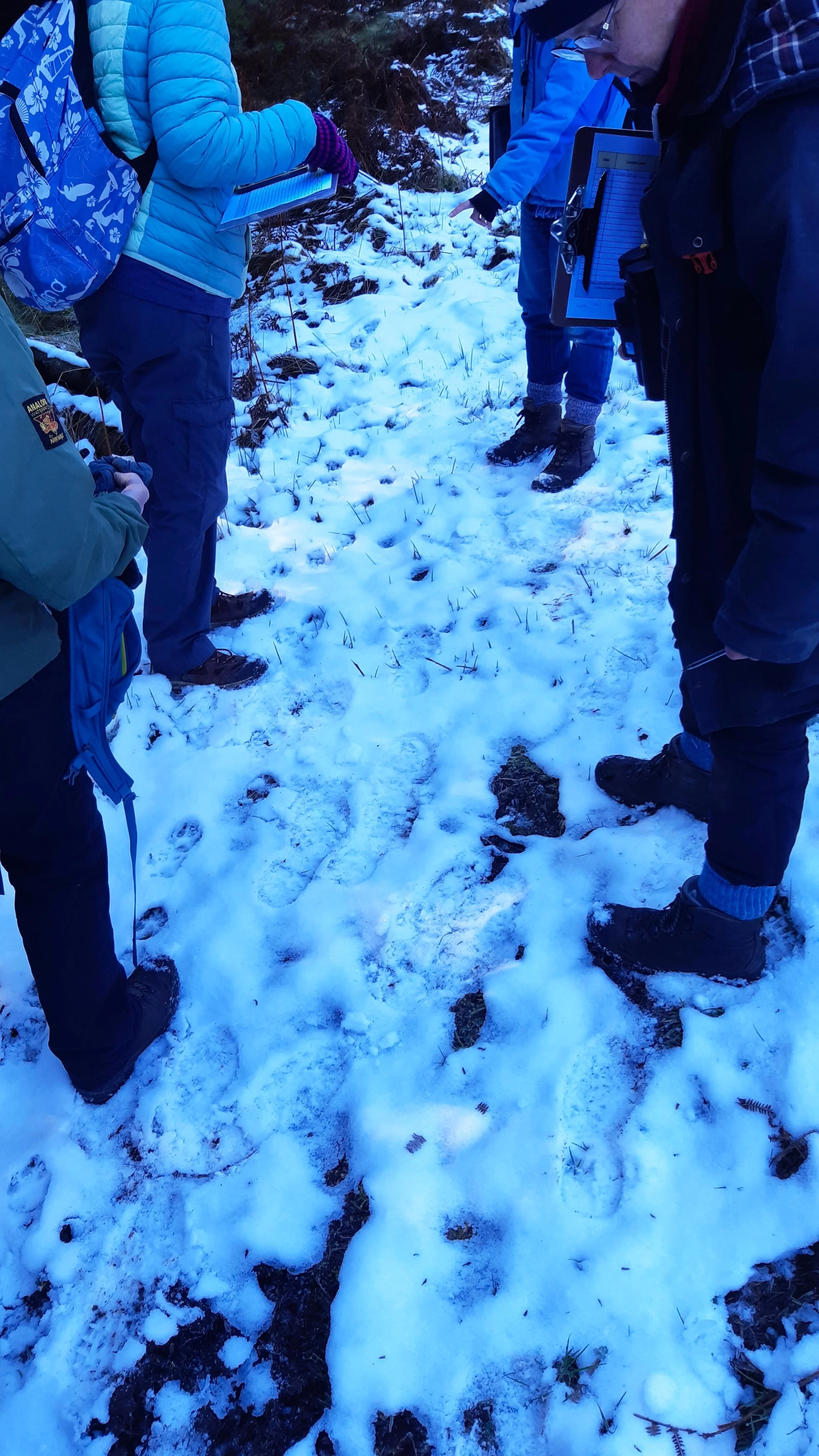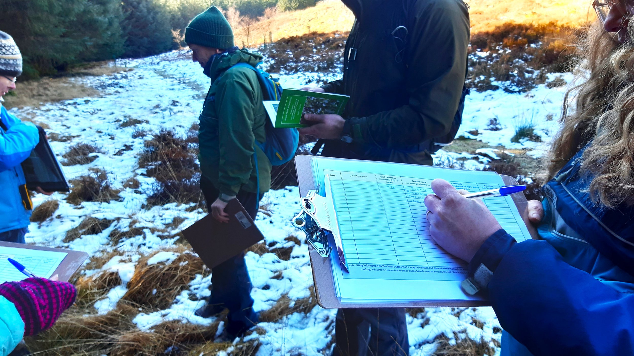 The group then headed outside to have a go at creating biological records for the species found along a 500m walk beginning at the JMT’s cabin and passing through some of the old conifer plantations at Glenlude. There was a huge contrast in temperature between the sunlight-flooded open spaces, and the shaded walks behind the trees where snow still lay.